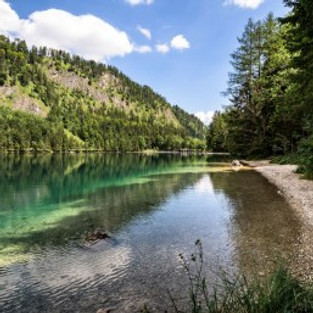 I walked along the right side of the lake. The clear water of the lake really fascinated me wherefore I have taken several pictures. The mountains in the background fit perfectly into the scenery.